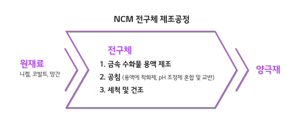 공침법은 가장 일반적으로 사용되는 전구체 제조방법입니다. 공침법은 금속 용액에 착화제를 첨가하여 금속 이온을 침전시켜 전구체를 제조하는 방법입니다. 공침법은 공정 단순화, 대량생산에 적합, 원가 경쟁력 우수 등의 장점이 있습니다.